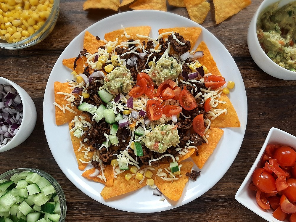 Mexikanischer Nachoteller mit Rinderhack und Guacamole