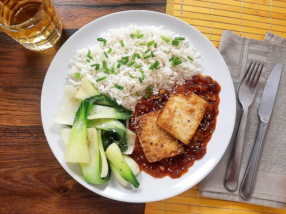 Knuspriger Tofu mit Soja-Birnen-Sauce zu Pak Choi und Reis mit Schnittlauch - Zusatzinformation