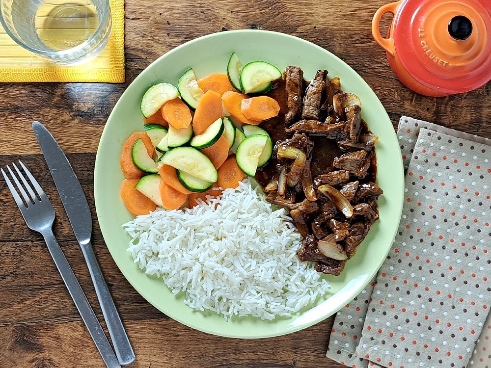 Rindfleisch in würziger Pfeffersauce mit Reis und gewoktem Zucchini - und Möhrengemüse - Zusatzinformation