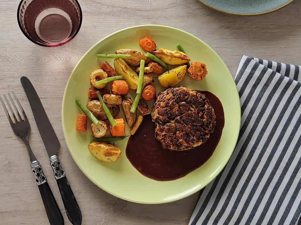 Champignon-Buletten (vegan) mit Ofengemüse und schwarzem Johannisbeeren-Jus