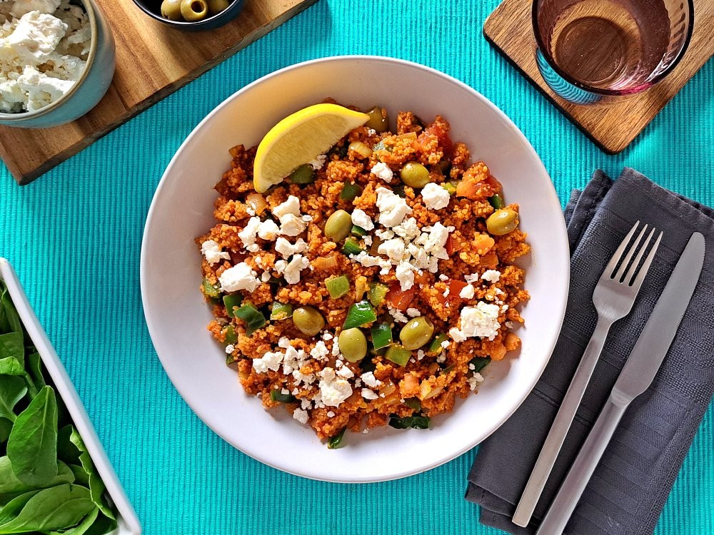 Ernährungsweise laktosefrei, vegan Kategorie Blitzrezepte, Familienfreundlich, Fitness Hauptzutat Gemüse Region griechisch, türkisch Schwierigkeitsgrad einfach Zutaten in der Kochbox Couscous, Chiliflakes, Knoblauch, Paprika grün, Rispentomaten, Fetakäse vegan, Oliven grün, Baby Blattspinat, Tomatenmark, Zwiebel, Zitrone, Optionale Zutaten in der Kochbox (abbestellbar) Kreuzkümmel, Gemüsebrühe Vorratskammer (gut zu Hause zu haben) Öl, Pfeffer, Salz Benötigte Kochutensilien Topf, Pfanne, Zitronenpresse Allergene enthält glutenhaltiges Getreide Spurenhinweis Nein Saison Nein Arbeitszeit in Minuten 20 Gesamtzeit in Minuten (2 Personen) 20 Wann kochen? Tag 1-4 - Bewertungen