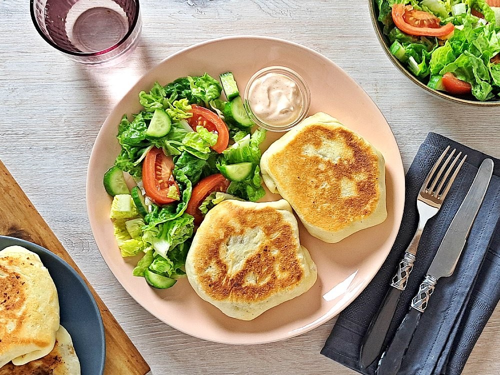 Fluffige Teigtaschen mit Veganhack zu Grünsalat und pikantem Dip - Zusatzinformation