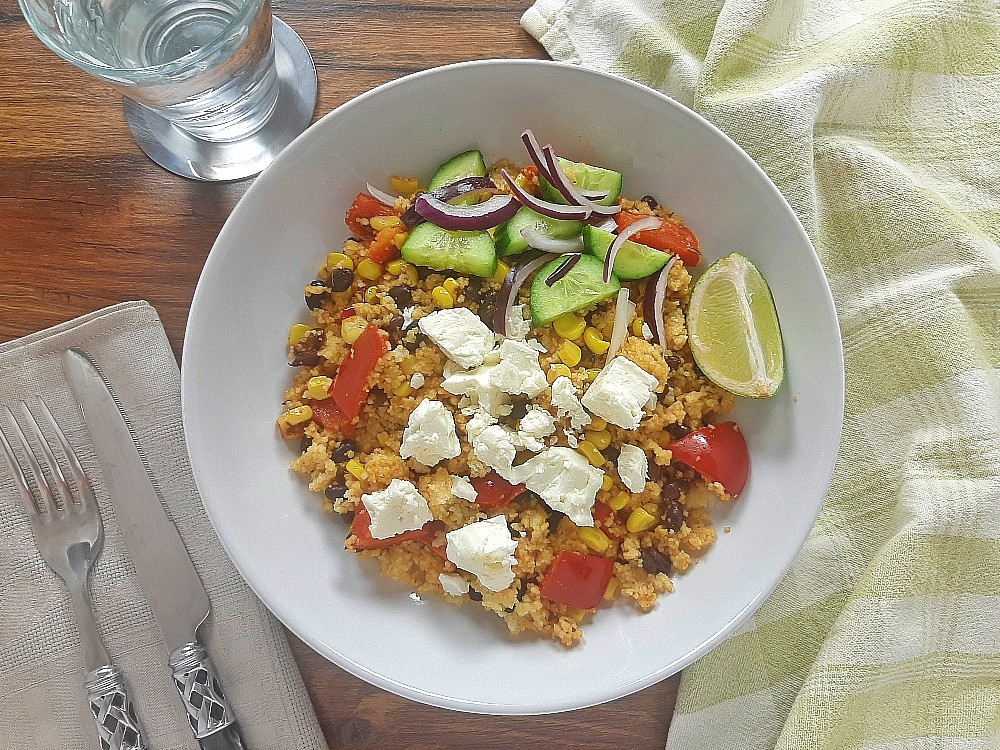 Cajuncouscous mit schwarzen Bohnen und Mais zu Feta, Gurke und roter Zwiebel - Zusatzinformation