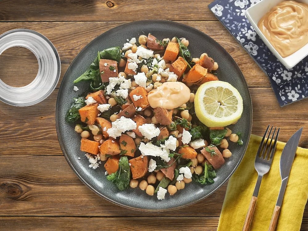 Geröstete Süßkartoffeln und Kichererbsen mit Fetakäse und scharfer Mayo