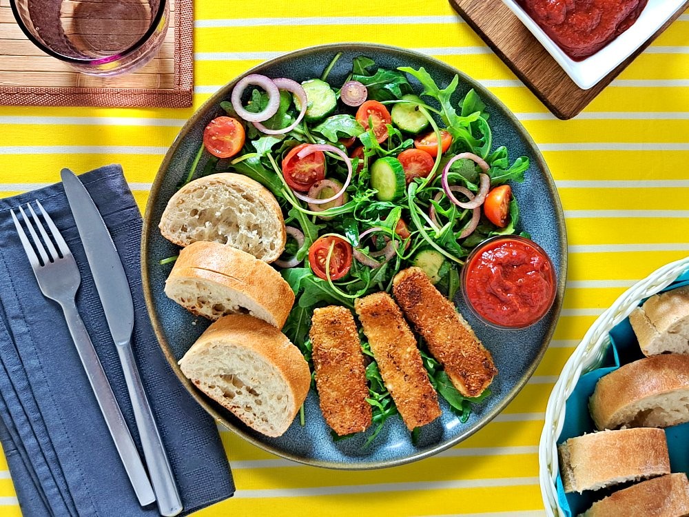 Ein frisches, mediterranes Gericht, das schnell zum Lieblingsessen wird: Knackiger italienischer Salat mit aromatischen Blattsalaten, frischem Gemüse und einem feinen Dressing bildet die Basis. Dazu kommen goldbraun gebackene Käsesticks mit schmelzendem Kern, ein würziger Tomatendip zum Eintauchen – und ofenfrisches Brot zum Abrunden. Leicht, sättigend und voller Geschmack – ideal als schnelles Abendessen oder besonderes Mittagessen.