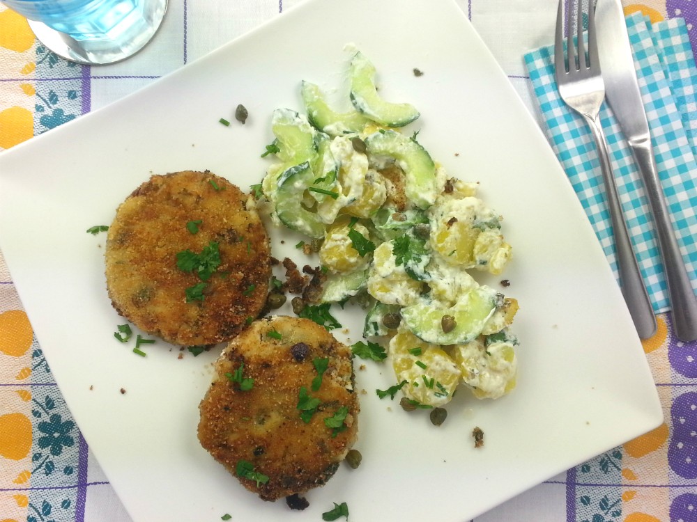 Ein Lieblingsrezept aus der Tischlineküche sind unsere Fischfrikadellen zu Gurken-Kartoffel-Salat mit Kapern. Die Fischfrikadellen haben eine schöne Konsistenz und sind gewürzt mit Senf, Zitronenschale und Cayennepfeffer. Außen sind sie etwas knusprig, während sie innen schön saftig bleiben. Dazu der hausgemachte Kartoffelsalat und die Sache ist rund. Einfach eine köstliche Mahlzeit mit wahrem Genuss! - Zusatzinformation